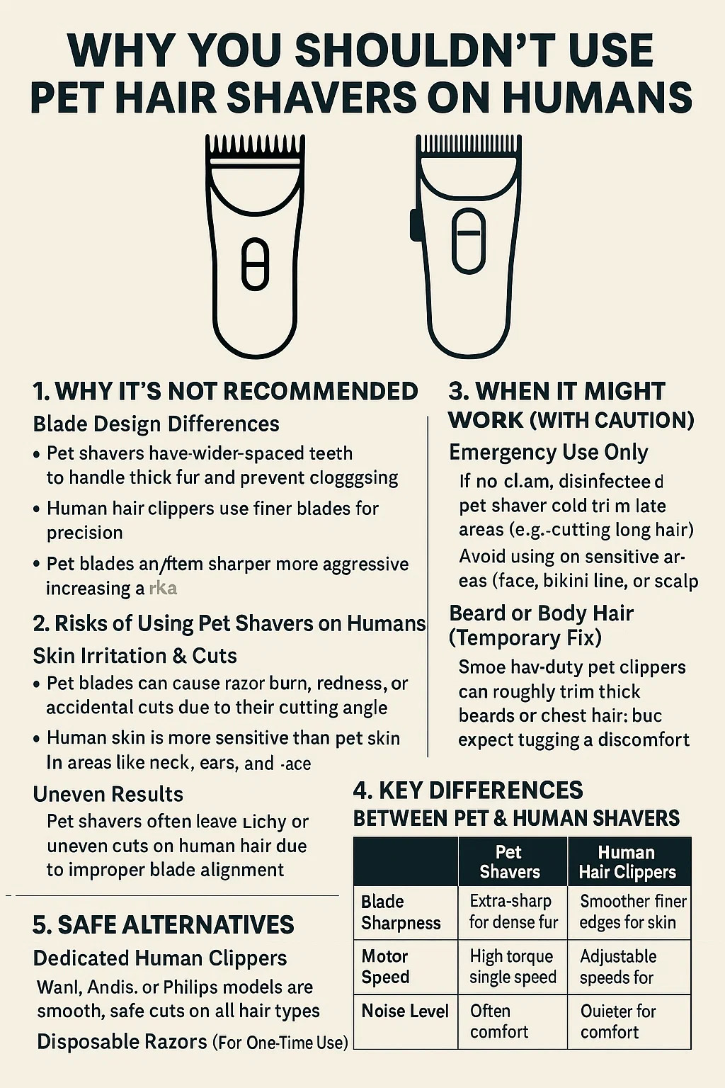 Holicí strojky pro domácí mazlíčky jsou postaveny pro hustou, hrubou kožešinu a mohou tahat nebo tahat za jemnější lidské vlasy.