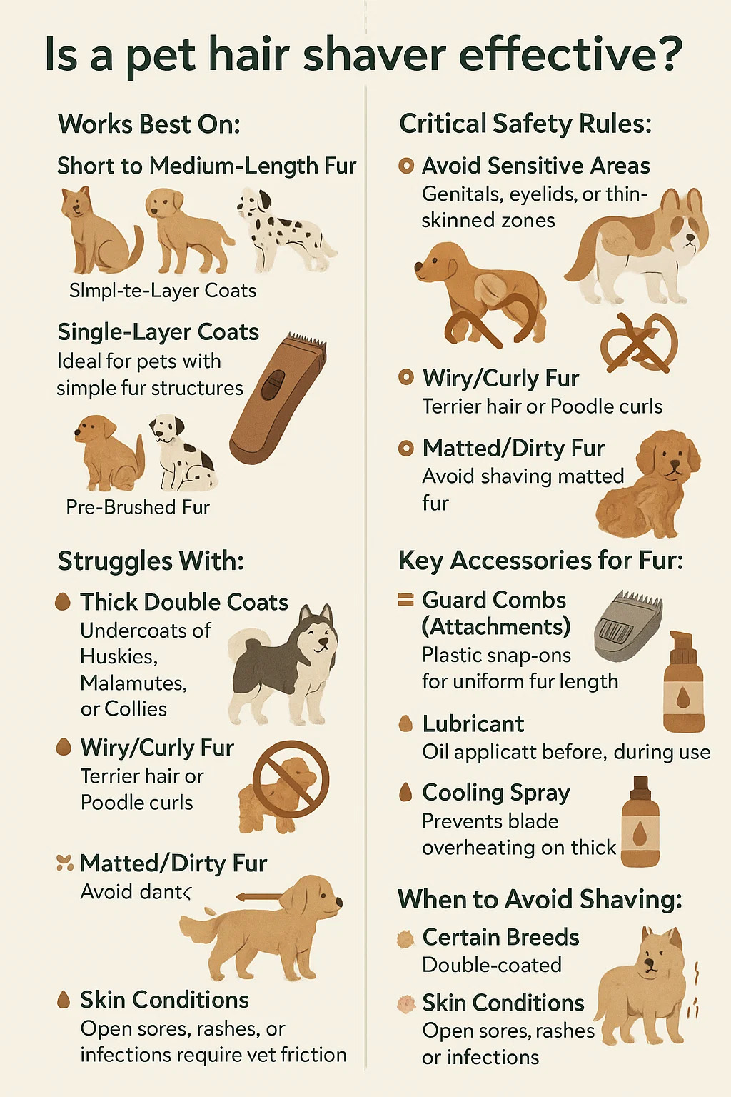 Některá plemena: plemena s dvojitou potaženou (např. Pomeranians, zlaté retrívry) se spoléhají na regulaci teploty. Holení může způsobit trvalé poškození kabátu.