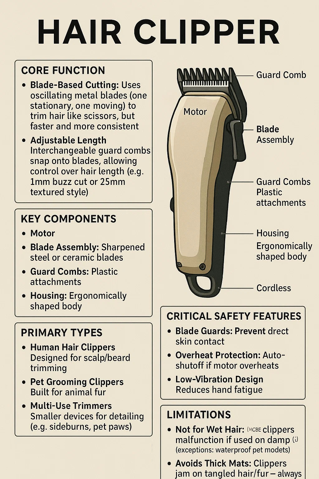 A Clipper Hair Clipper je nástroj pro péči o elektrickou péči navržený tak, aby vlasy efektivně a jednotně řezaly vlasy. Zde je podrobné rozdělení jeho základních funkcí a použití: