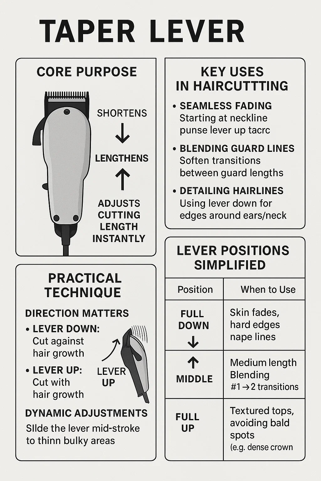 Páka zapnutá Clippers vlasy (často se nazývá páka páky nebo nastavení čepele) slouží přesné funkci nezbytné pro profesionální srážky. Níže je praktické poruchy: