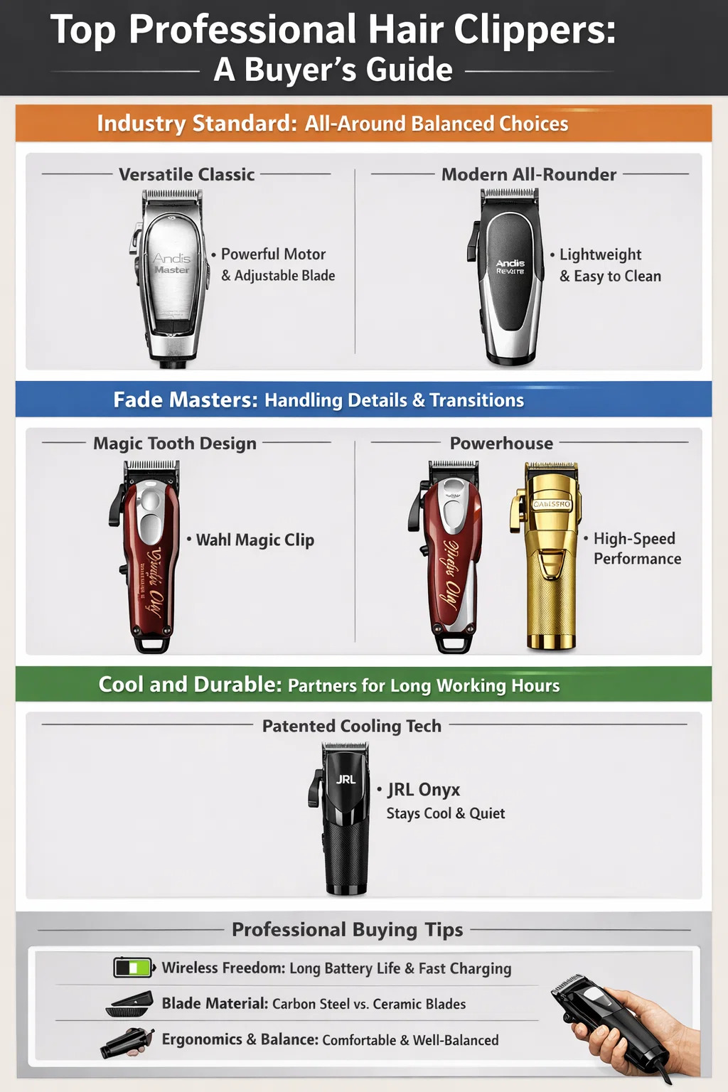 Pokud hledáte profesionální úroveň zastřihovače vlasů , holiči obvykle upřednostňují sílu, ostrost čepele a vyvážené zacházení. Zde jsou některé z nejvýkonnějších profesionálních modelů, které jsou v současné době na trhu: